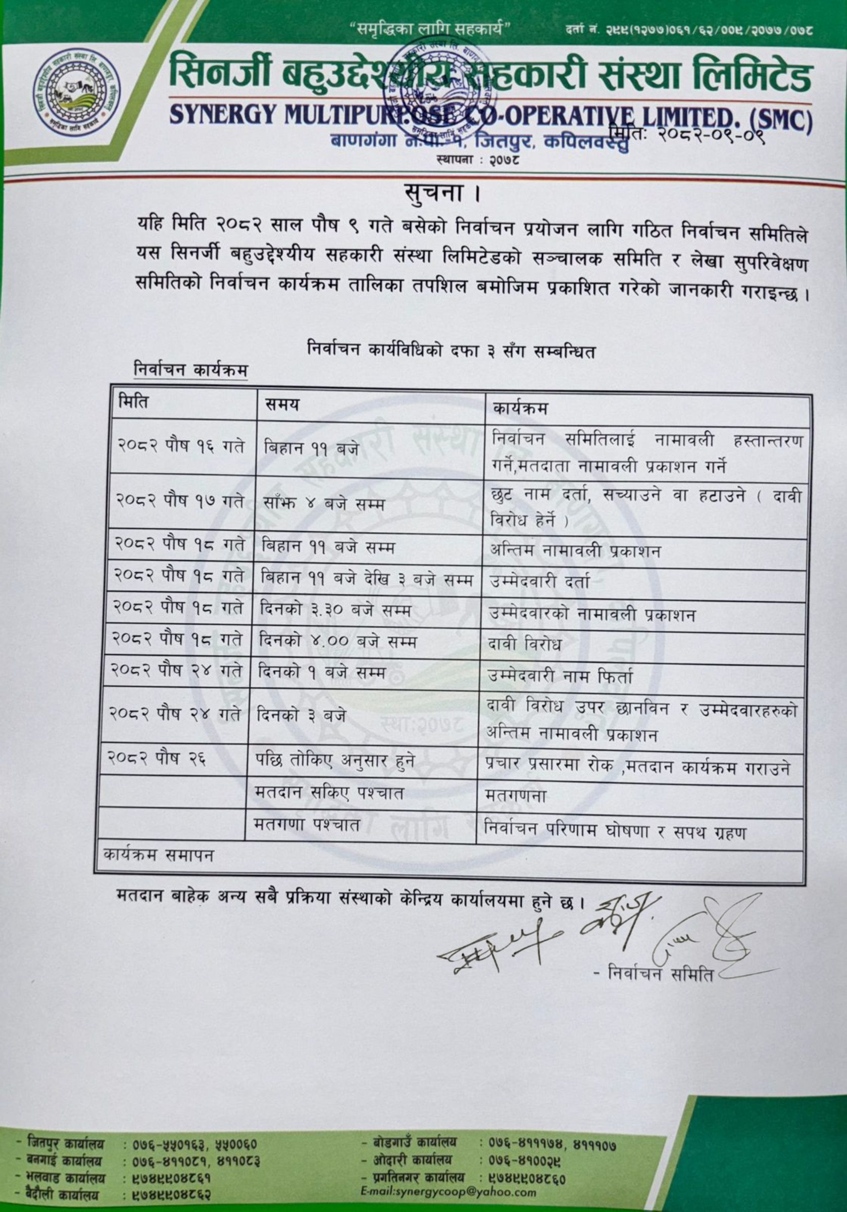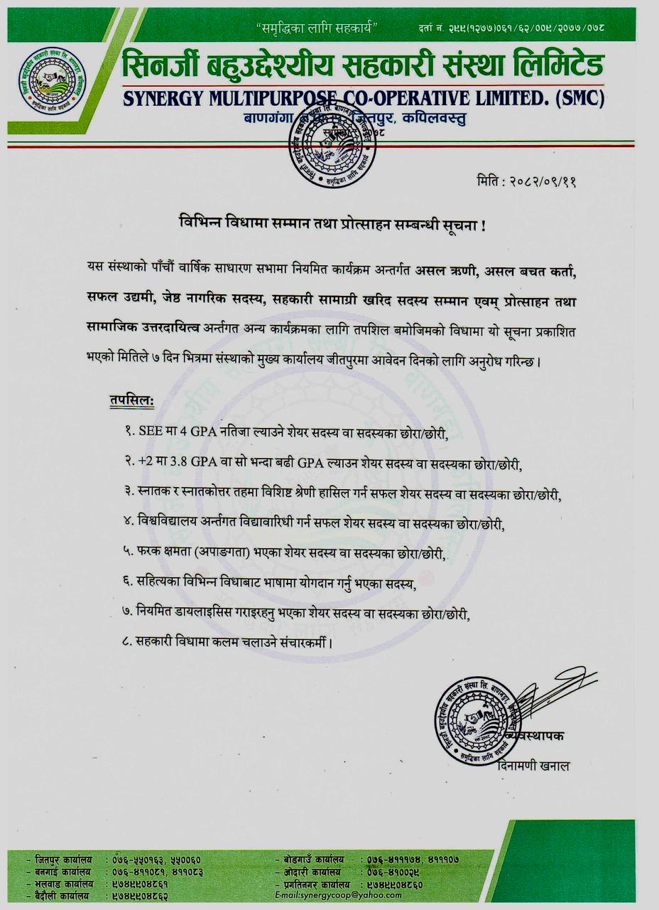 आदरणीय सम्पूर्ण शेयर सदस्यज्यू, नेपाल सरकारले स्वः स्फूर्त रुपमा सहकारीहरूलाई एकीकरणका लागि आह्वान गरेको परिवेशमा हामीले मिति २०७७ साल भाद्र २८ गते संयुक्त कार्यदल गठन गरी औपचारिक रुपमा कार्य अगाडि बढायौं र कार्यदलले आफूले पाएको जिम्मेवारी अनुसार कार्य सम्पादन गर्दै मिति २०७८ साल असार १५ गते बाणगङ्गा नगरपालिकाबाट एकीकृत सहकारीको रुपमा सिनर्जी बहुउद्देश्यीय सहकारी संस्था लि. ले कानुनी वैधता प्राप्त गर्यो र हामीले असार २२ गते घोषणा तथा कारोबारको शुभारम्भ समारोह सम्पन्न गर्न पुग्यौं । सहकारी क्षेत्र वित्तीय क्षेत्रको राष्ट्रको तीन खब्बे अर्थ नीतिको एक अभिन्न अङ्ग बन्न पुगेको परिवेशमा सहकारीहरूलाई उत्पादन र सदस्यमुखी भई कार्य सम्पादन गर्नु ....
